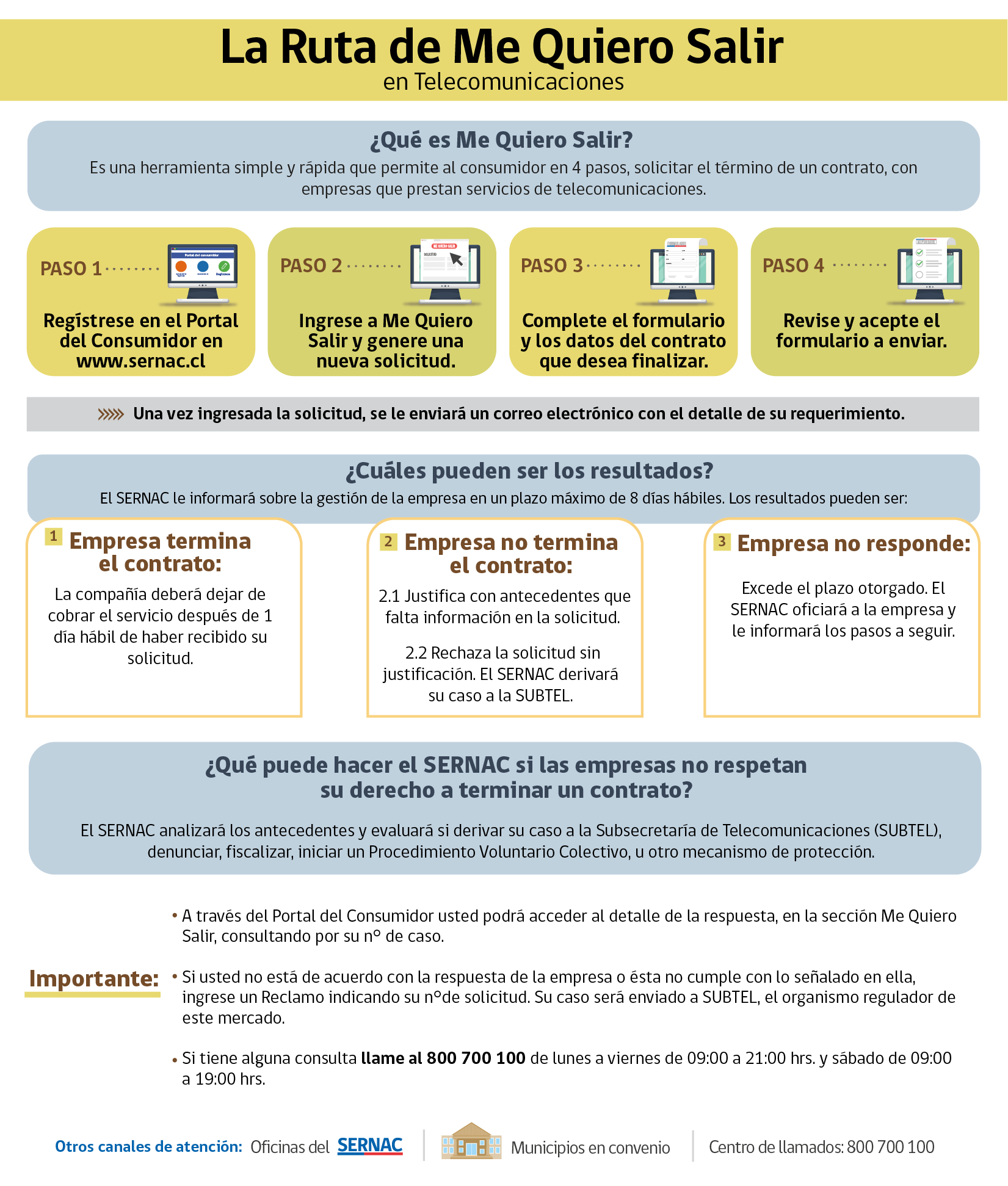 El servicio está disponible desde el año 2020 en la página www.sernac.cl y permite finalizar los contratos suscritos con empresas de telecomunicaciones, dado que concentran el mayor número de reclamos respecto a las barreras de salida. Señalaba la publicación oficial del ministerio de economía, que titulaba "Gobierno lanza plataforma ‘Me Quiero Salir’ para agilizar vía web el término de contratos de prestación de servicios".