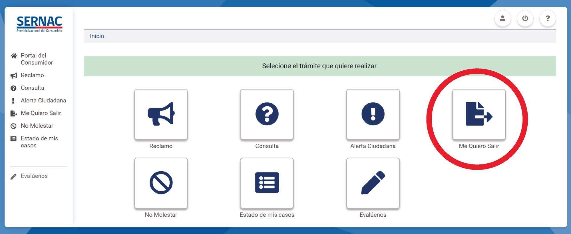 Este trámite sólo se puede hacer en línea a través del Portal del Consumidor del SERNAC, ingresando en Me Quiero Salir y completando el formulario siguiendo los siguientes pasos: